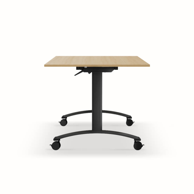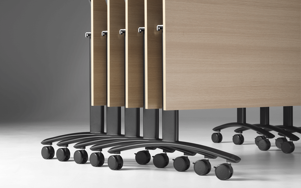 Díky inovativnímu, patentovanému mechanismu naklápění horní desky je možné stůl snadno složit či rozložit během několika sekund – a to pouze jednou osobou. Kolečka s brzdou a stabilní kovové nohy umožňují bezproblémovou manipulaci i skladování více stolů najednou.