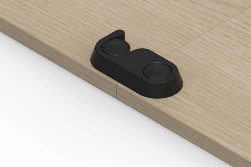Desku lze vybírat ze sedmi odolných laminátových dekorů, které se snadno udržují a dobře zapadají do různých interiérů. Pomocí jednoduchého zámkového systému lze více stolů bezpečně propojit do větších pracovních sestav. Díky univerzálnímu uchycení je možné použít i jiné standardní stolové desky.